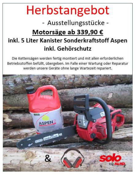 - gratis Erstinspektion für die Marke solo by AL-KO für Rasenmäher oder Rasentraktoren im Wert von 44,95 € bzw. 99,90 € (exkl. Materialkosten)