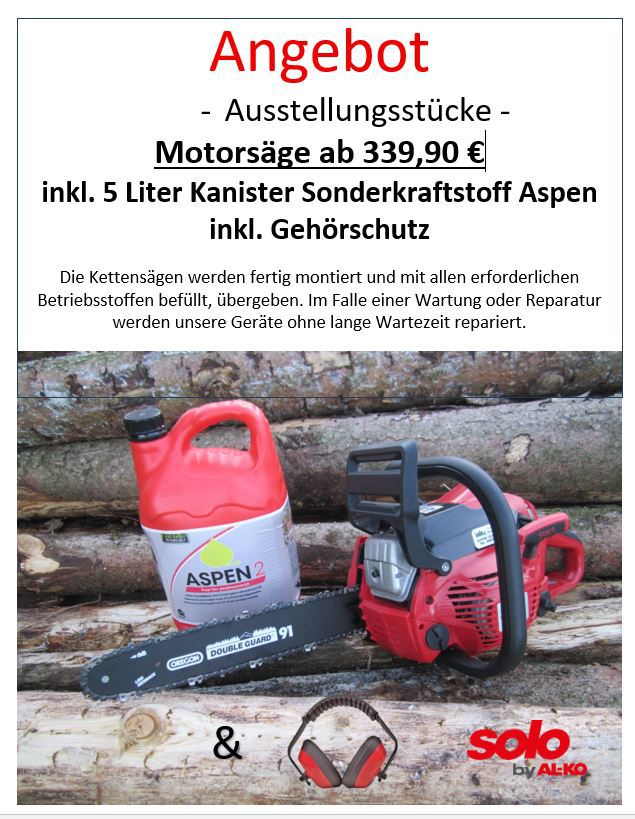 Beim Kauf erhalten sie einen 5 Liter Kanister Sonderkraftstoff Aspen sowie einen Gehörschutz gratis dazu.